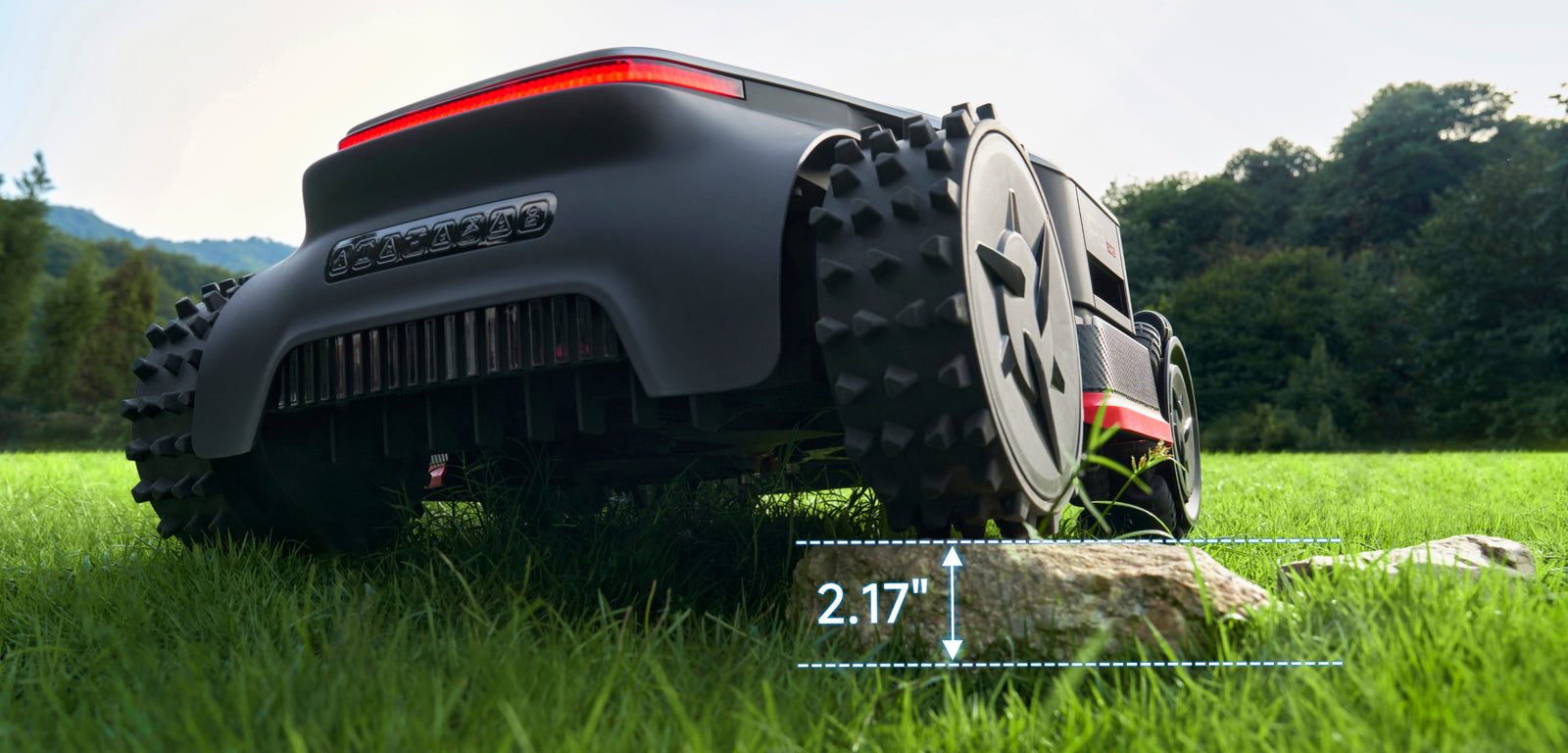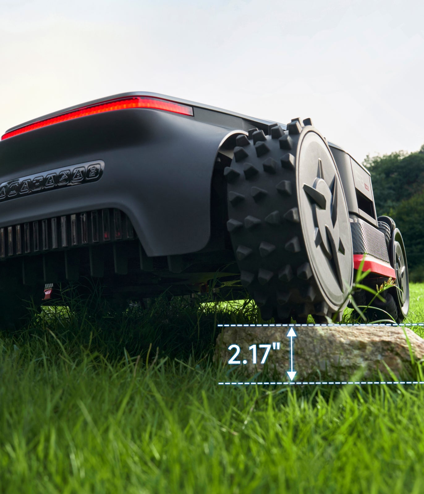 With true 4-wheel drive, this remote control lawn mower climbs slopes up to 80% (38.7°) and crosses obstacles up to 2.17"*-so hills, roots, and rough patches won't interrupt your mowing routine