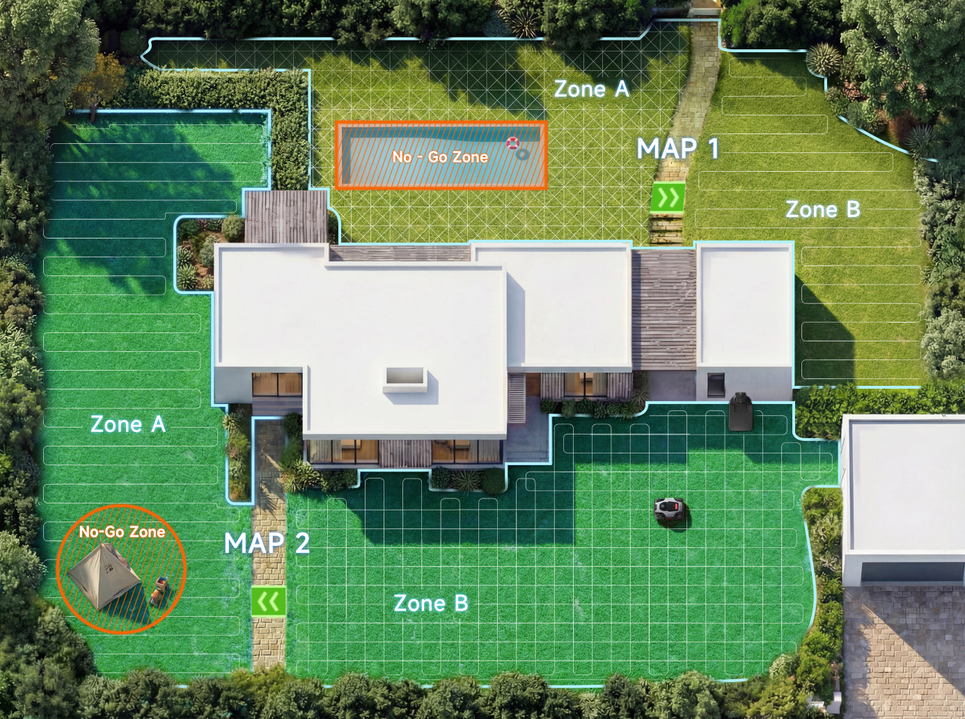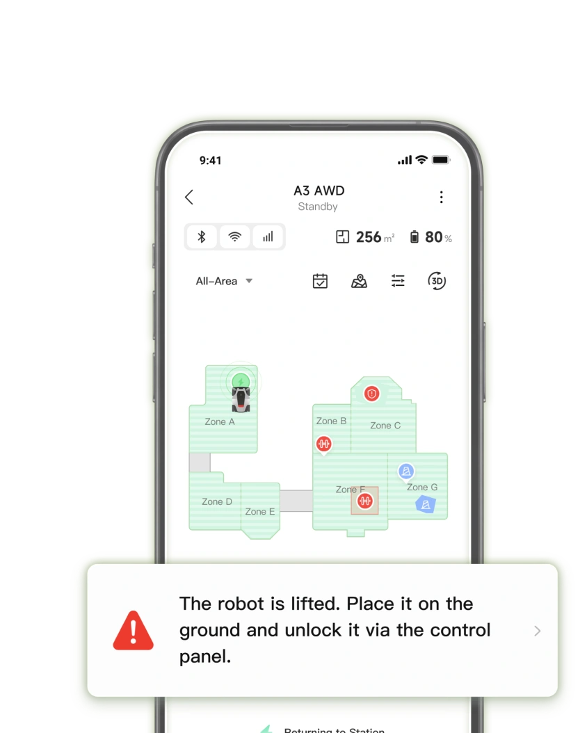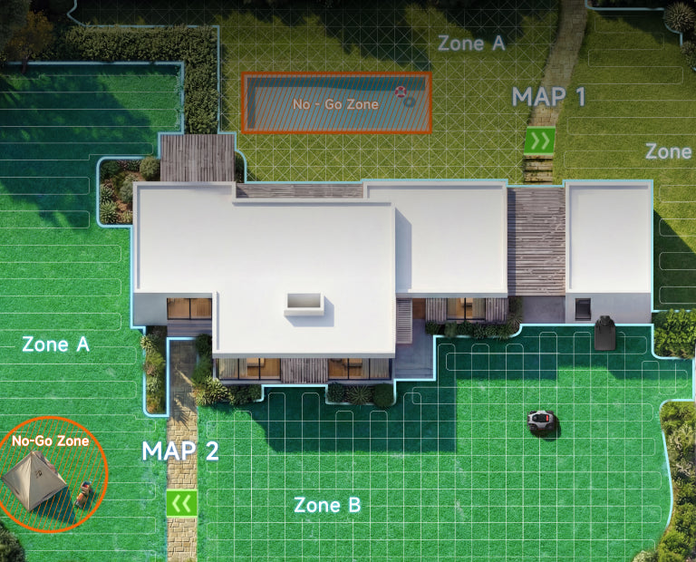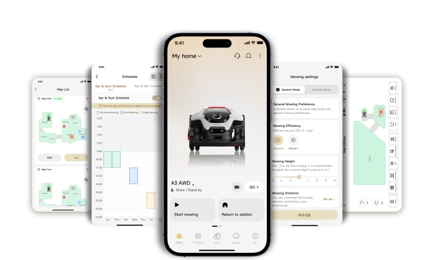 Upon startup, the system immediately initiates mapping without the need for boundary lines, beacons, GPS stakes, or antennas. The intelligent system takes full control. It can automatically recognize lawn boundaries and generate a 3D virtual map covering up to 0.5 Acre